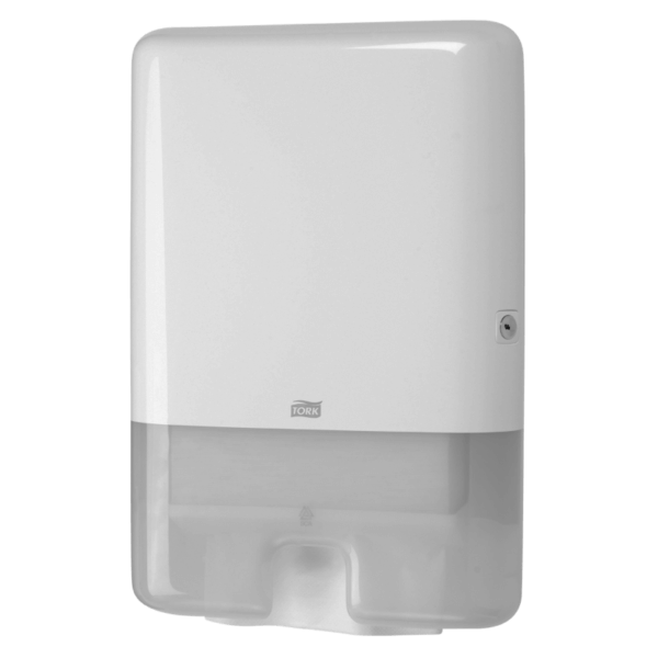 Distributeur essuie-mains Tork H2 blanc/noir en plastique ABS résistant. Fermeture à clé, fenêtre de contrôle, distribution optimisée des essuie-mains Interfold.
