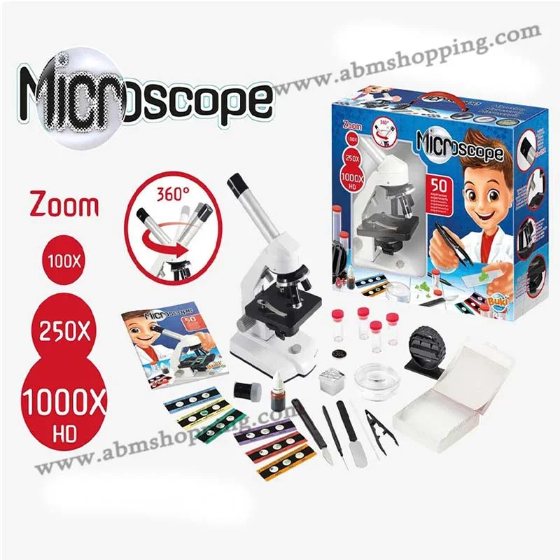 Un microscope en métal avec optiques et oculaires en verre pour des observations de grande qualité ! 3 zooms : X 100 – X 250 – X 1000 HD. Nombreux accessoires inclus: lamelles, pince, mélangeur, étiquettes, boite de Petri, micro trancheuse…