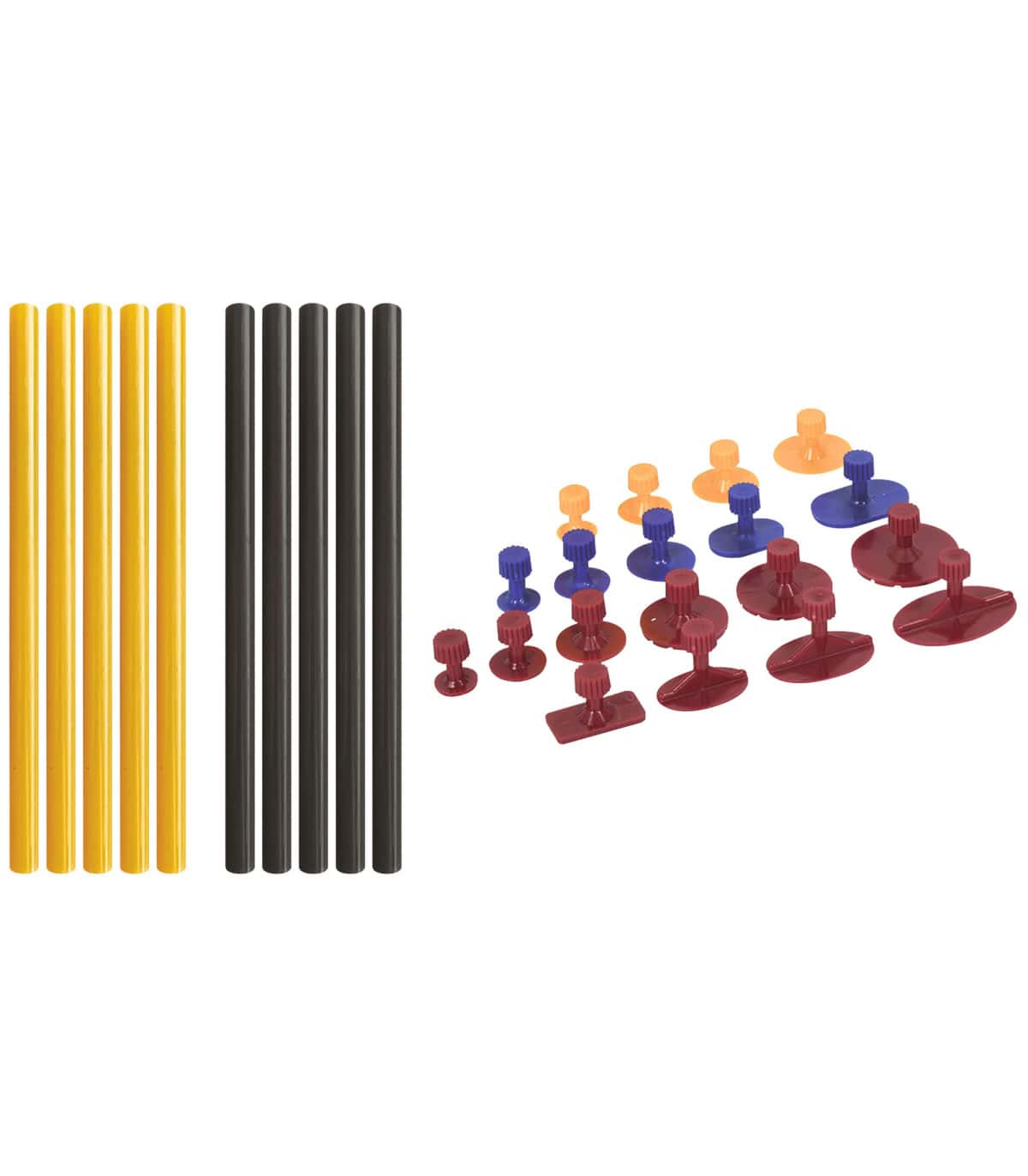 Ce kit de bâtons de colle et de ventouses à coller vient compléter le kit de débosselage sans peinture 328151. Le kit comprend plusieurs types de ventouses de débosselage à coller, elles sont adaptées pour différents impacts : circulaires, allongés, ou pour des arêtes. Le kit de débosselage 328151 est conseillé pour les impacts de types : grêle, coups de portières, coups de ballons et autres.