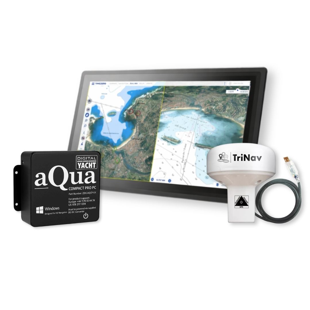 “Ce système de navigation sur PC comprend un PC Aqua Compact, le logiciel Timezero Navigator, un GPS160 avec interface USB et un écran LCD de 18,5″ ou 24.”