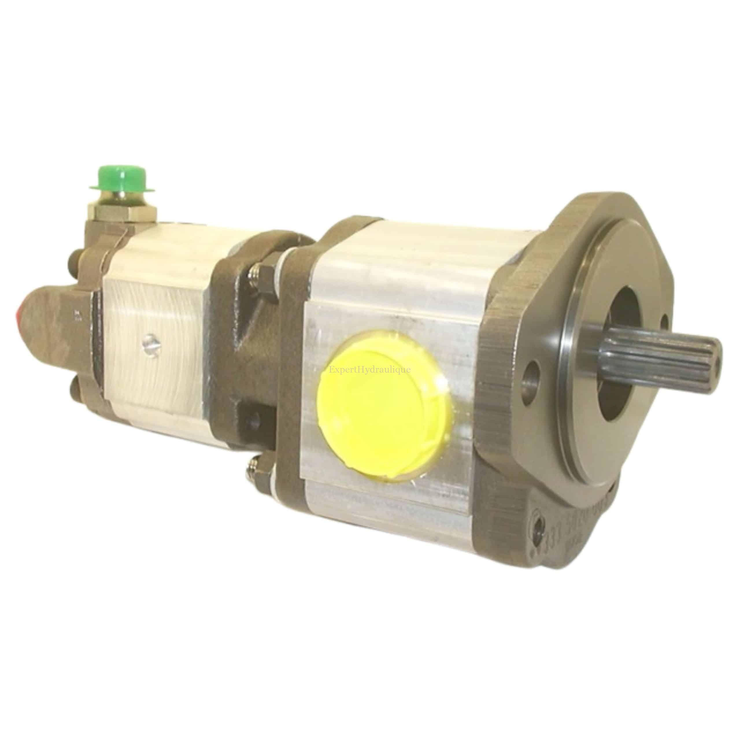 Pompe tandem à engrenage hydraulique en aluminium : 3339521059 pour charriot télescopique JCB : TLT30D. Flasque 2 trous avec un arbre cannelé 13 dents.