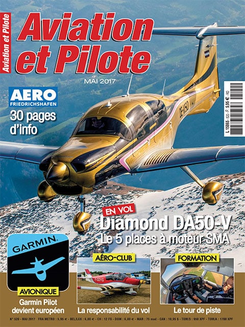 Dans le numéro de mai 2017 d’Aviation et Pilote, Jacques Callies a essayé en exclusivité le DA50-V équipé du moteur diesel Safran-SMA de 260 cv. Un nouveau Diamond aux qualités exceptionnelles. L’avion était justement exposé en Allemagne lors de la dernière édition du salon Aero Friedrichshafen. Ce événement attendu par le milieu de l’aviation générale fait l’objet d’un long dossier de 32 pages qui aborde l’actualité des constructeurs et équipementiers et expose les sujets qui ont fait débat : le poids des ULM, la GA Roadmap de l’EASA, la CS-23, le DTO (Declared Training Oraganisation), le BIR (Basic Instrument Rating, La CS-STAN, le coavionnage… La rédaction a également choisi de mettre en avant l’application Garmin Pilot, dont vient de sortir une nouvelle version : il est désormais possible de réaliser avec un vol de A à Z en Europe. Dans la rubrique « C’est mon histoire », un pilote témoigne d’un vol difficile du point de vue météo : proche de leur destination, ils entrent avec son copilote dans un cumulonimbus. Erreur… Jean-Michel Bossuet poursuit son apprentissage et revient sur ses premiers tours de piste. Notre instructeur Régis Hua-Van aborde quant à lui sur la notion de responsabilité telle qu’elle est perçue dans les règlements intérieurs de certains clubs.