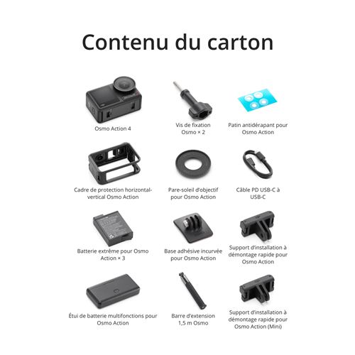 DJI Osmo Action 4, 3 batteries, 1 support d’installation à démontage rapide, 1 base adhésive incurvée, 1 cadre de protection horizontal-vertical, 1 pare-soleil d’objectif, 1 câble PD USB-C/USB-C, 2 vis de fixation, patin antidérapant, 1 étui de batterie multifonctions, 1 barre d’extension 1,5 m, 1 support d’installation à démontage rapide pour Osmo Action (Mini).