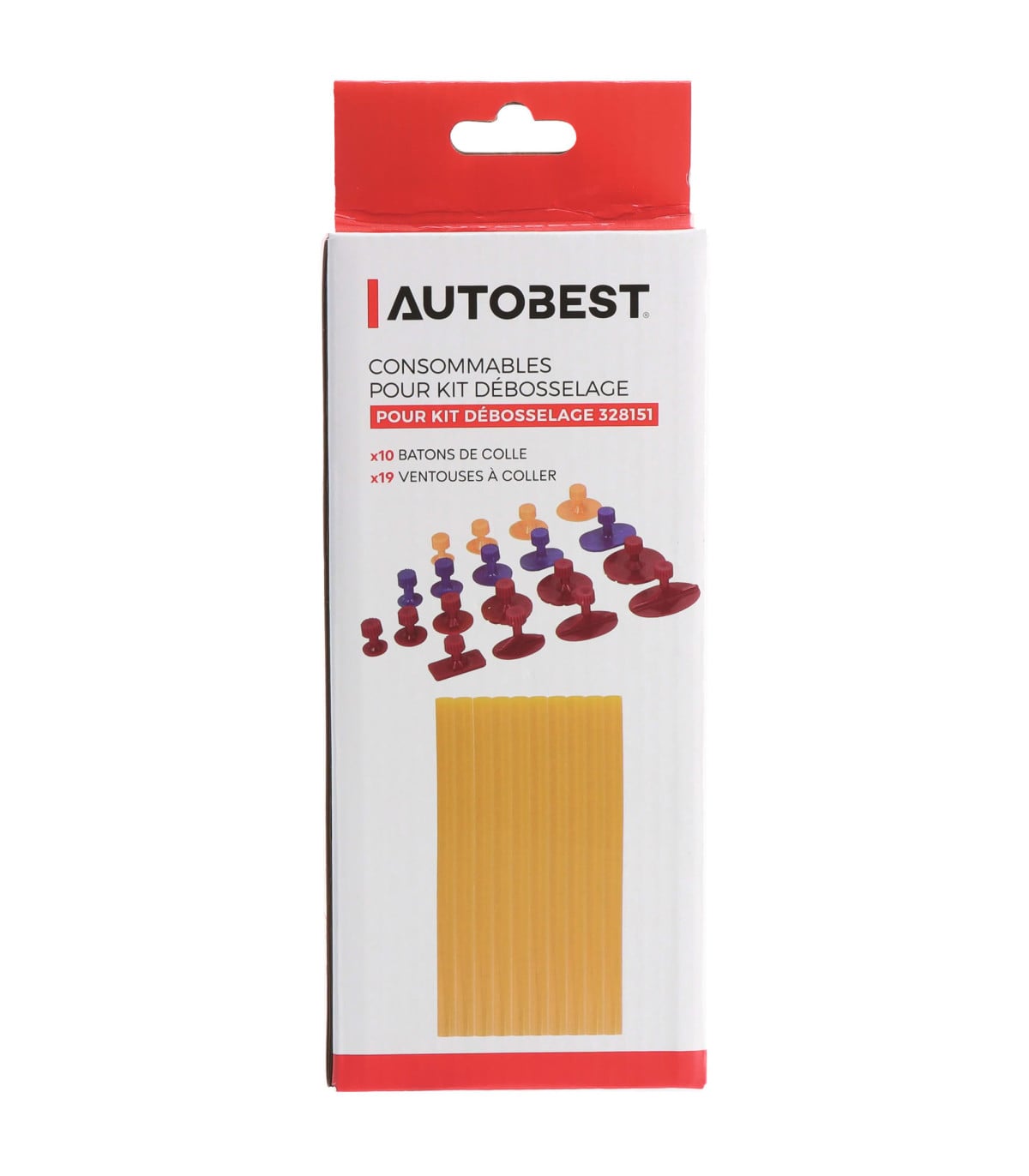 Ce kit de bâtons de colle et de ventouses à coller vient compléter le kit de débosselage sans peinture 328151. Le kit comprend plusieurs types de ventouses de débosselage à coller, elles sont adaptées pour différents impacts : circulaires, allongés, ou pour des arêtes. Le kit de débosselage 328151 est conseillé pour les impacts de types : grêle, coups de portières, coups de ballons et autres.
