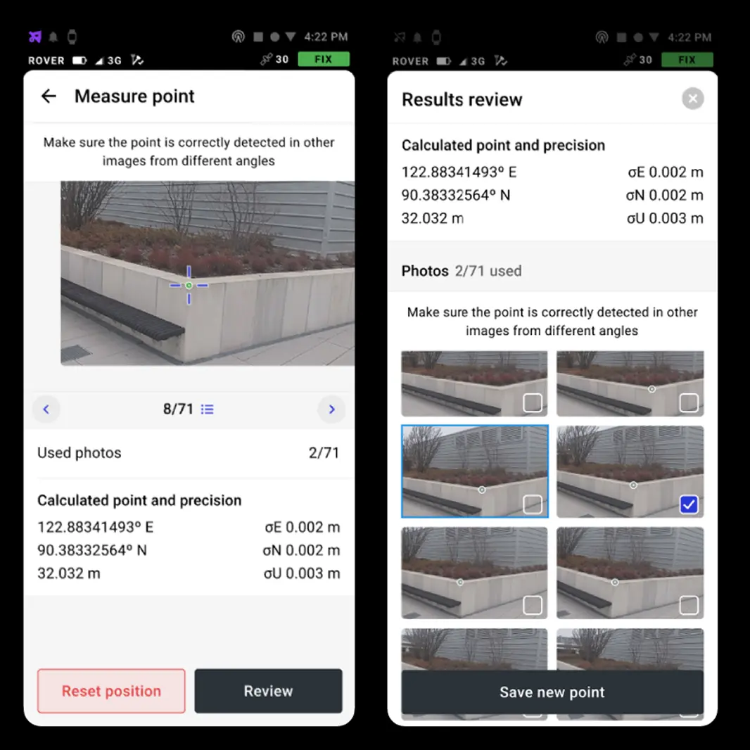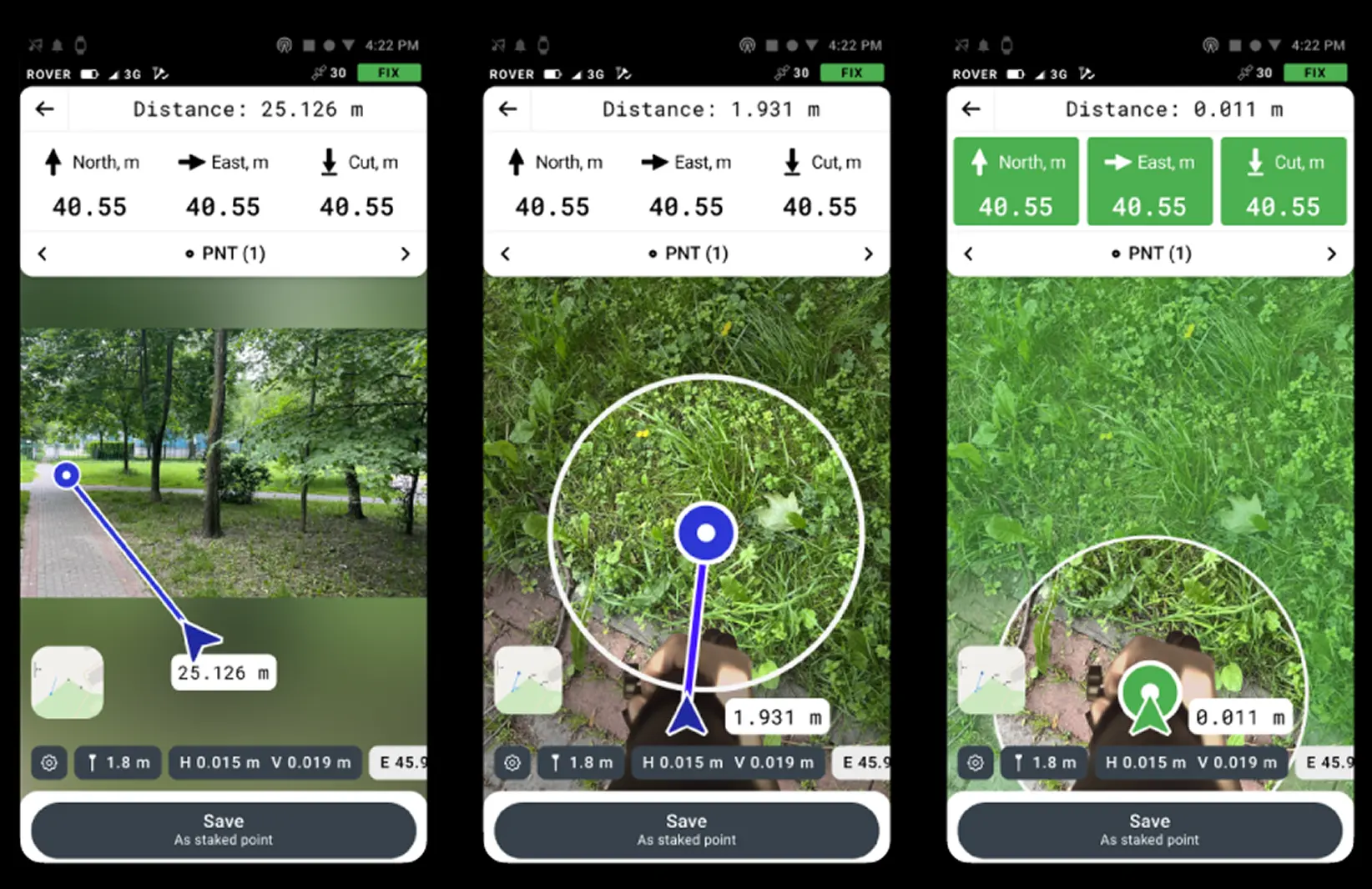 Avec ses caméras, couplées à la puissance de l’applcation Emlid Flow, l’implantation devient un jeu d’enfant. Chargez vos fichiers (.csv / .dxf / .shp / .kml) via l’application Emlid FLow et laissez vous guider par votre récepteur qui vous pointera la position du point à implanter.