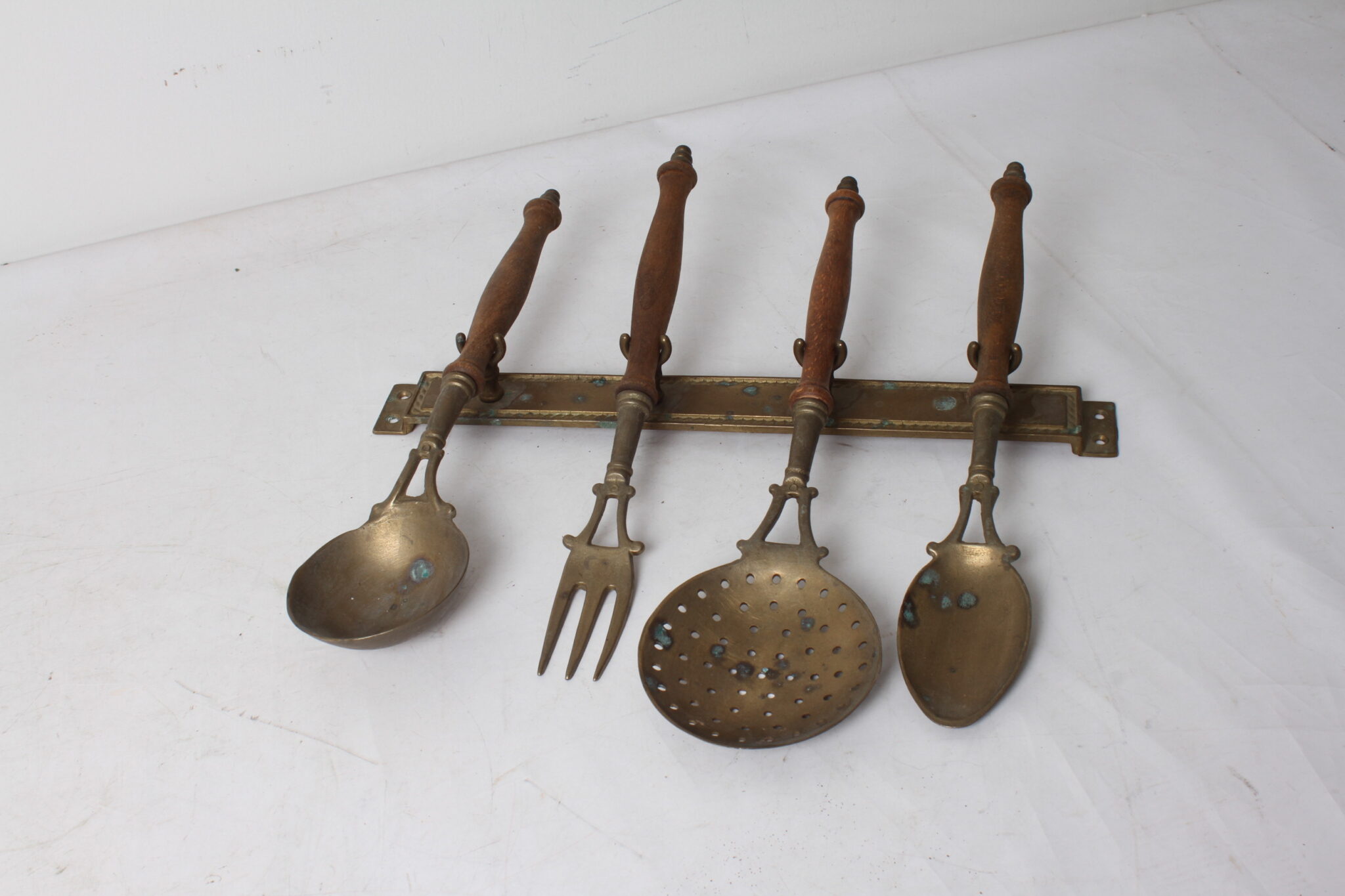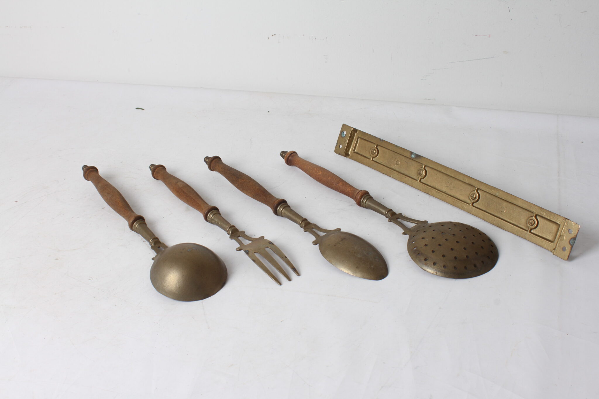 Ensemble composé d’une fourchette, d’une cuillère, d’une louche,d’une passoire et d’un support mural.