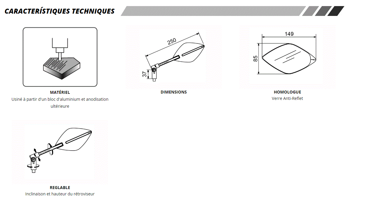 Les rétros sont fraisés à partir d’un seul bloc d’aluminium taillé dans la masse puis anodisé noir, garantissant une finition parfaite.