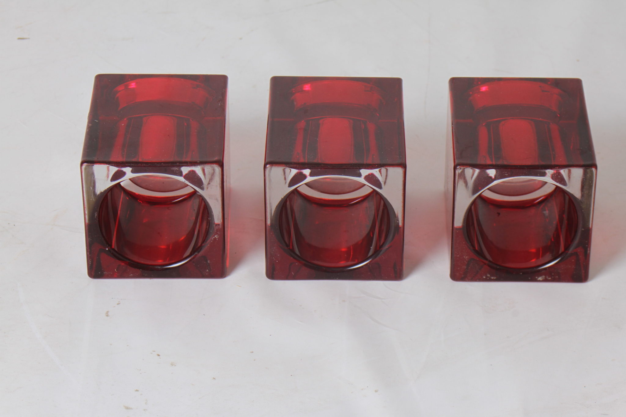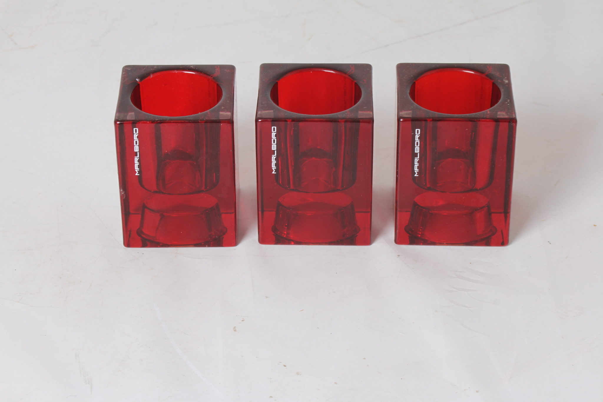 Trois bougeoirs photophores MARLBORO en verre rouge.