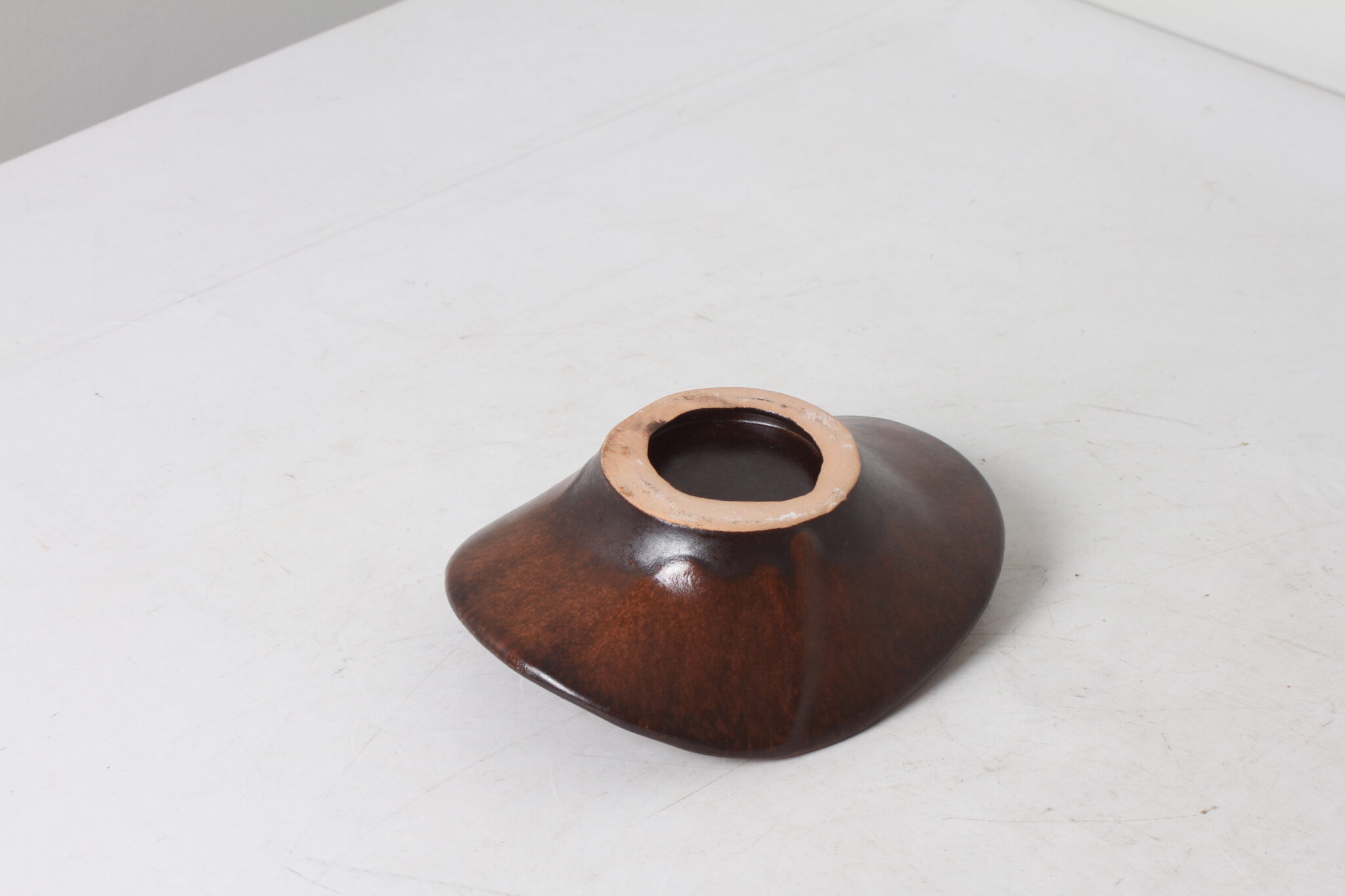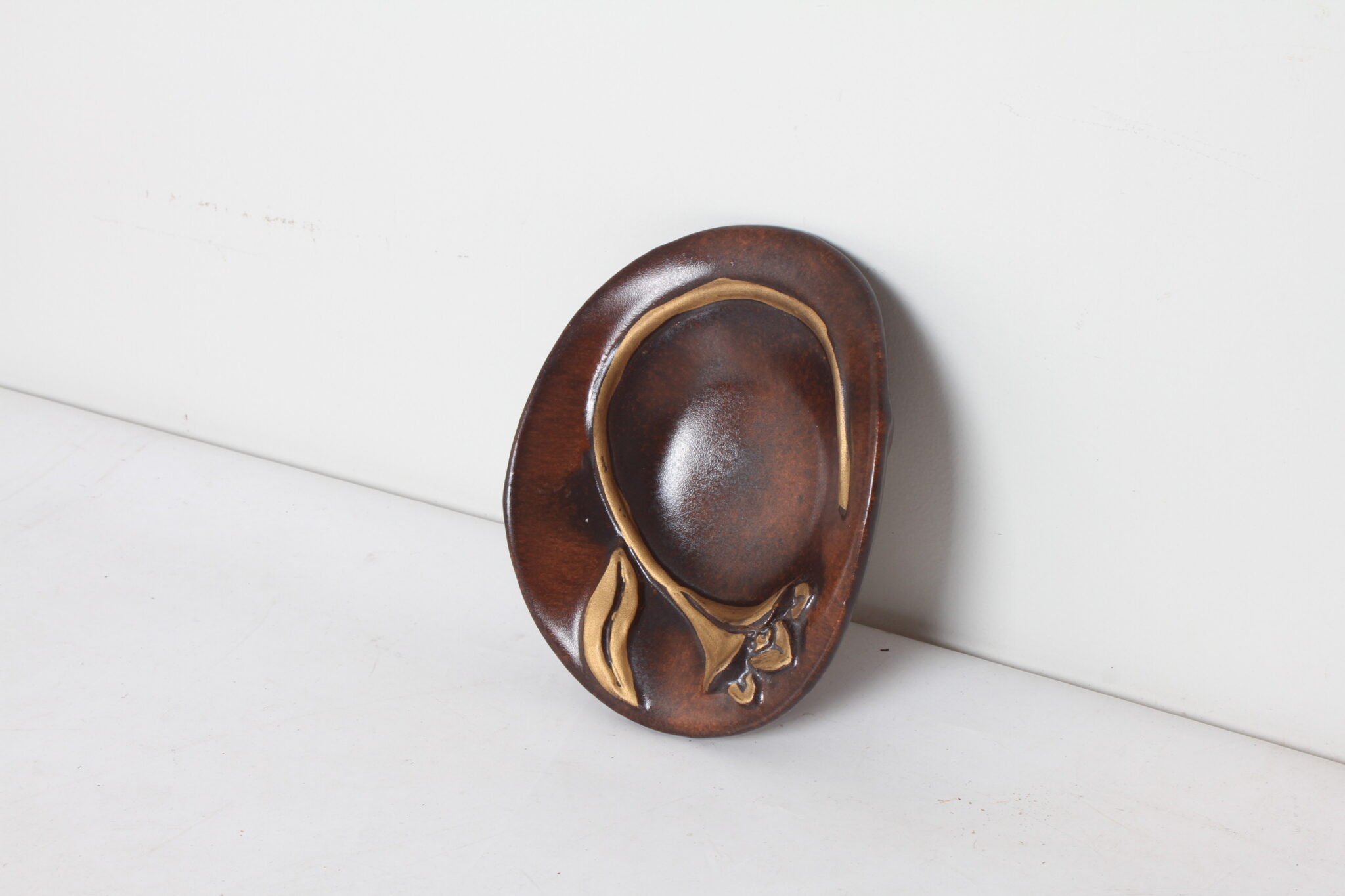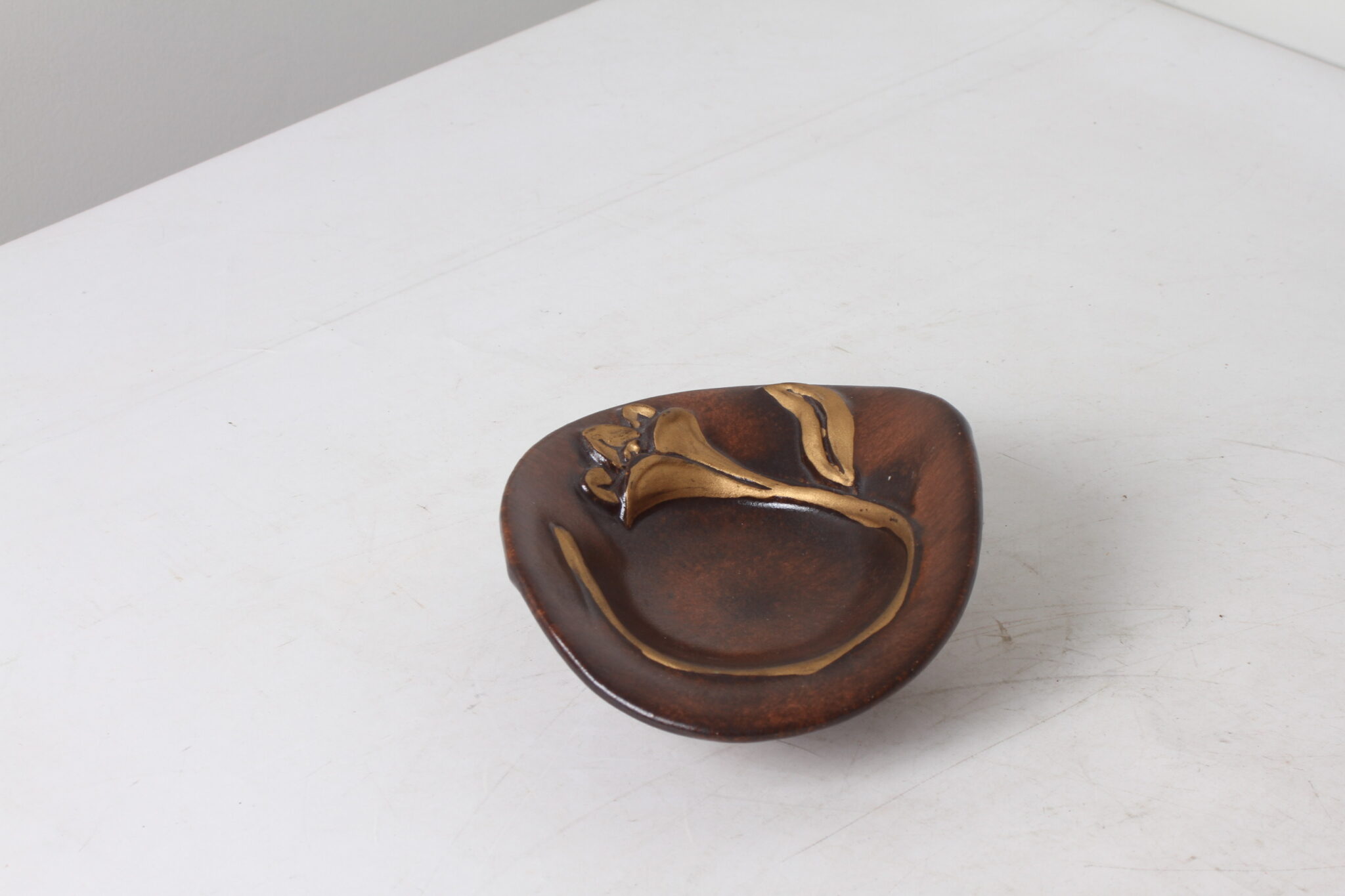 Vide poche de forme libre en céramique marron avec décor floral doré en relief.